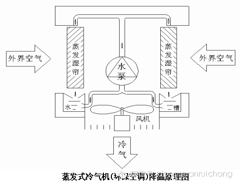 蒸發(fā)式冷氣機降溫原理可參照下圖,機組工作時,首先是由水泵把底盤中的水抽上來,然后由布水管均勻的把水分布到蒸發(fā)濕簾頂部。水隨即淋濕整個蒸發(fā)濕簾的接觸面積,最后回到底盤。當風機工作時,外面的新鮮空氣被迫從蒸發(fā)濕簾中經(jīng)過,濕簾表面的水蒸發(fā)吸收空氣中的熱量。此時從風機送出來的空氣,就是經(jīng)過降溫處理過的新鮮冷氣。