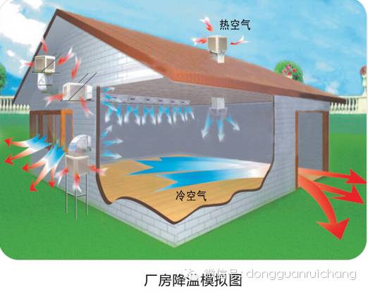 過去是采用自然風,以熱壓與風壓原理通過排氣孔、天窗進行通風換氣,也有在屋頂裝排氣風帽來達到上述目的,但其效果顯然不佳。從圖中可以看出,室外新鮮空氣經(jīng)過蒸發(fā)式冷氣機的過濾、降溫后,通過風管,或者直接通過風口,源源不斷送到室內各個角落,由于系統(tǒng)采用了大量的新風,使室內處于正壓狀態(tài),從而可以把室內帶有異味、粉塵、混濁悶熱的空氣排出,最終達到降溫換氣的目的。
